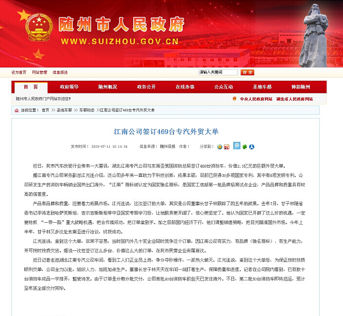 今年3月份,在與國內(nèi)外20余家競爭對手的市場競爭中,湖北江南公司依靠產(chǎn)品質(zhì)量和信譽取勝,成功與菲律賓簽訂了469臺消防車的銷售合同,并且已按照菲律賓客戶的產(chǎn)品要求,研發(fā)、試制、小批量、直至大批量生產(chǎn),截止2015年7月底,江南公司已成功交付給菲律賓客戶120余臺消防車。