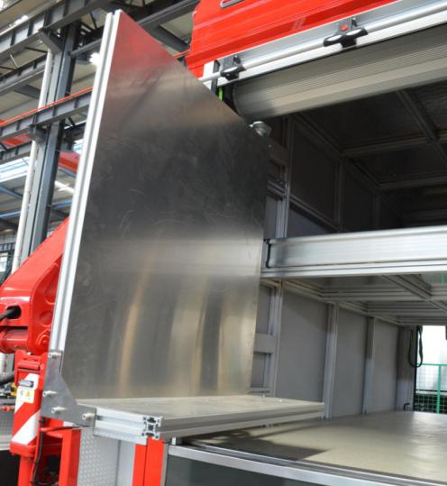 右側(cè)后器材艙布置有立式旋轉(zhuǎn)拓展板,前板裝配有雙層器具收納盒,收納存放小型工具和專用器材,背板采用掛式支架,收納專用扳手、卡鉗、剪刀等器具;右側(cè)前器材艙布置有立式抽拉拓展板機(jī)構(gòu),采用重型多節(jié)滑軌抽拉式結(jié)構(gòu),方便消防員快速取用/收納器材和專用工具等。