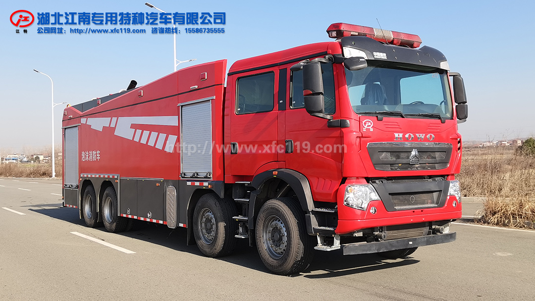 JDF5380GXFPM180/Z6型泡沫消防車采用重汽豪沃ZZ5447TXFV466MF5底盤改裝而成。整車由消防員乘員室和車身兩大部分組成,乘員室為原裝雙排,可乘坐2+4人,該車為外露罐結構,中部為罐體,后部為泵房。載液罐體為優質碳鋼,內部噴涂環氧底漆及環氧瀝青漆,與底盤采用彈性連接,載水量13000kg,泡沫5000kg,裝備了上海雄真消防設備有限公司生產CB10/100-XZ型常壓消防泵,額定流量100L/S,車頂安裝成都威斯特消防機械有限公司生產的PL80型車用消防炮。該車最大的特點是載液量大、操控性好、維修簡便。可廣泛應用于公安消防隊、廠礦企業及社區、碼頭等場所,撲救大型油類火災和一般物質火災。